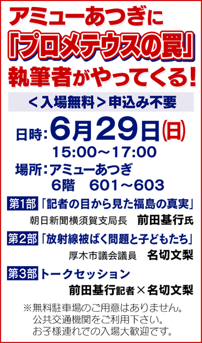 6月29日(日)にアミューあつぎで、『プロメテウスの罠』の執筆者の一人、朝日新聞横須賀支局長の前田基行氏を招き、報告会とトークセッションを行います。申込み不要、入場無料です。当日は、ぜひお越しください。