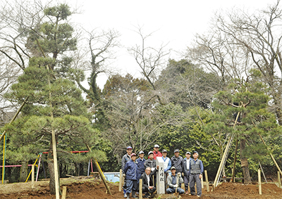 この日は、同まつり実行委員会(西海幹男委員長)の委員など17人が参加。飯山で長年営む鈴木園芸(鈴木行男代表)の全面バックアップの元、夫婦松のプロジェクトは進められた。