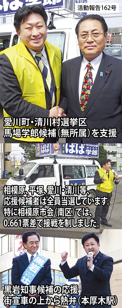 昨年末の総選挙、2月の厚木市長選挙、4月の統一選(前半・後半)と他候補の応援を「力一杯」させて頂きました。私は、無投票での当選となりましたが、想いと気持ちは、県議会の仕事でお返しします。