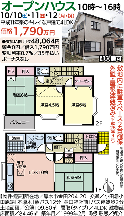 子育て世代にぴったりな戸建て4LDKのオープンハウスが、明日10月10日(土)から3日間行われる。場所は、金田陸橋近くの厚木市金田204の20。時間は、午前10時から午後4時まで。申込み不要で見学無料。主催は、(株)プラスホーム(能勢健一代表)。