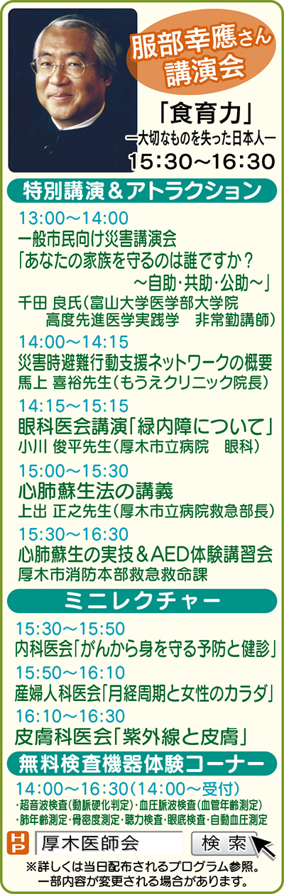 今年のゲストは、食・料理の専門家としてメディアに出演する服部幸應さん。「食育力〜大切なものを失った日本人〜」がテーマ。時間は3時半から4時半。一般市民向け災害講演会(1時〜)や災害時避難行動支援ネットワークの概要紹介(2時〜)、眼科医会講演(2時15分〜)もある。