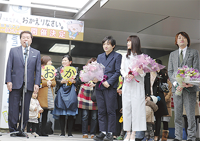 セレモニーでは、同級生やゆかりのある人がサプライズで花束を贈呈。メンバーは驚きながらも、笑顔で花束を受け取った。小林常良市長は「いきものがかりの皆さん、おかえりなさい。10周年記念ライブが成功するように、協力していきたいです」と3人の凱旋を祝福した。