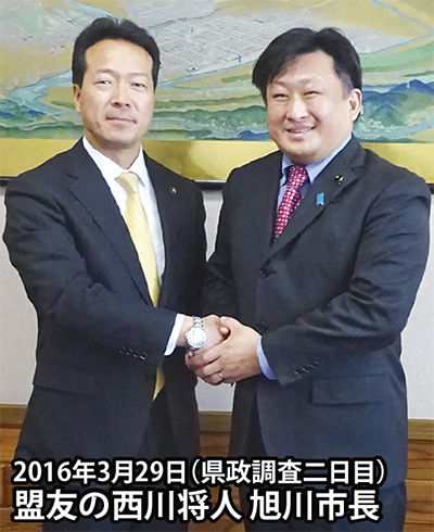 旭川市長・西川氏とは、同じ釜の飯を食った仲間として、これまで以上に連携を深めて、地方自治の推進に力を尽くして参ります。