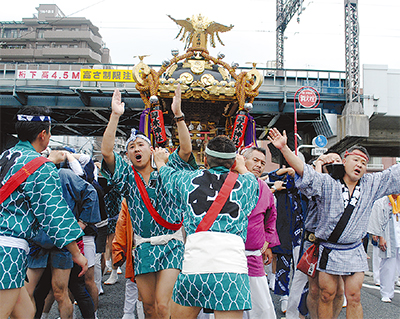 この日は出発前、今年生まれた赤ちゃんを抱いて神輿の下を通り、無病息災を祈る「神輿くぐり」を実施。その後威勢の良い声とともに神輿が神社を出発した。