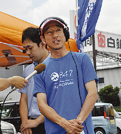 7月19日、サークルK東名厚木インター北店では駐車場から車が溢れ、店の前には”少ない方”だという60人ほどの見物客が集結していた。お目当ては、FMヨコハマ名物リポーター、「藤田くん」でお馴染みの藤田優一さんの「街角リポート」=写真。終了後のサイン会では、愛車にサインを書いてもらう強者もいるほどの熱狂ぶりだった。