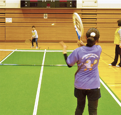 バウンドテニスは通常より狭いコートで行う生涯スポーツのひとつ。大会には、関東1都7県の小学1年生から中学3年生124人が参加。学年や性別ごとの6部門で順位を競い合った。