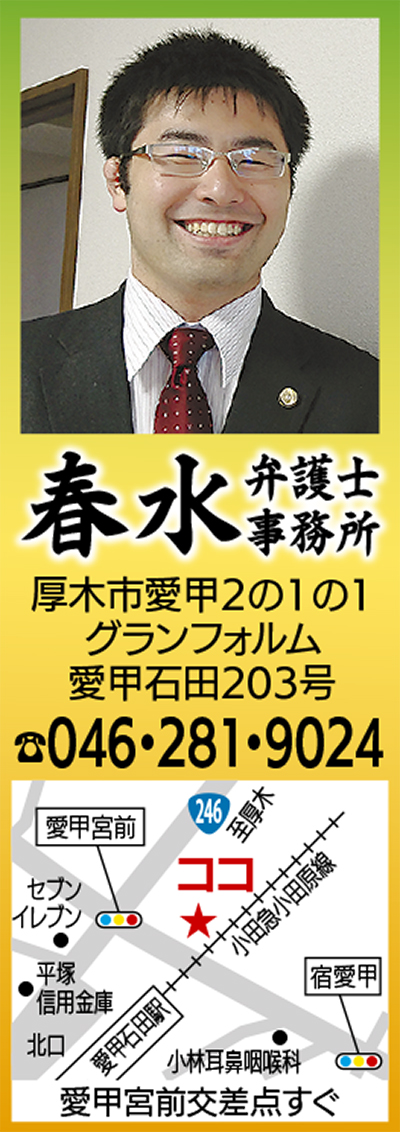 「春水」とは「春になり、雪が解けて豊かに流れる水」の意。代表の田代弁護士は、離婚・相続・交通事故・労務・債務・過払金・など幅広い分野の知識と経験を持つ法律家。県弁護士会の子どもの権利委員会にも所属。いじめ問題にも応じてくれる。■春水(しゅんすい)法律事務所【電話】046・281・9024
