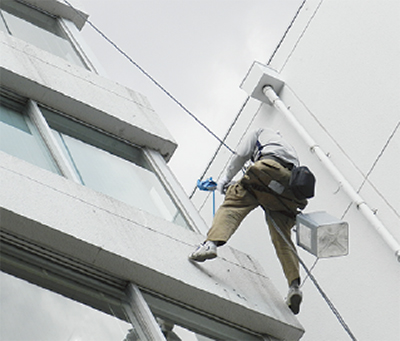 近年、首都圏近郊で注目を集めている「無足場工法」。足場を組まず、ロープブランコで行うためメンテナンス費を削減でき、オーナーからも好評を得ているという。同社は同工法を行える県内でも数少ない地元企業。相談はお気軽にお電話で。