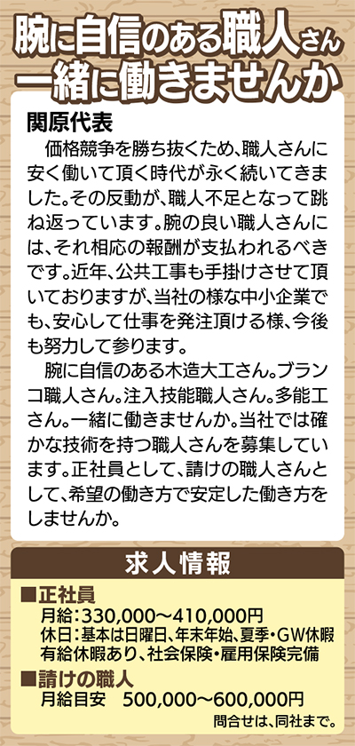同社では現在、御子息である関原新之介専務取締役が関原代表とともに現場を切り盛りする。関原専務は「今後は、下請け・孫請けの垣根が無くなり、リーズナブルで質の高い仕事が求められていくと思います」と顧客目線で先を見据える。同社は着実に、次のステージへと歩みを進める。