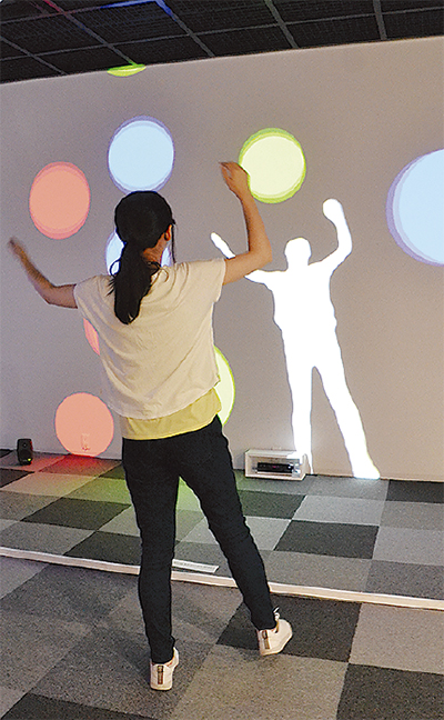 入場してすぐに視界に飛び込むのは、壁面のスクリーンに、赤・緑・青の光の3原色のボールが躍るインタラクティブアート(鑑賞者参加型の芸術作品)。スクリーンに映った鑑賞者の影が触れると、赤や青のボールがさまざまな方向に躍動し、重なり合って新たな色彩を生む仕組みだ。