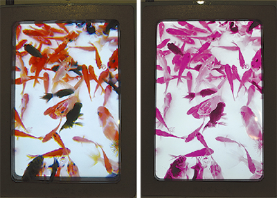 ほかにも、カラー印刷の4原色に基づき、4枚のパネルを自由に重ねて色の変化を楽しむ体験型装置や、植物の紅花に含まれる赤色色素を題材に佐々木麻衣子さん(2016年卒業)が制作した16分間の映像作品『紅』などが観覧できる。