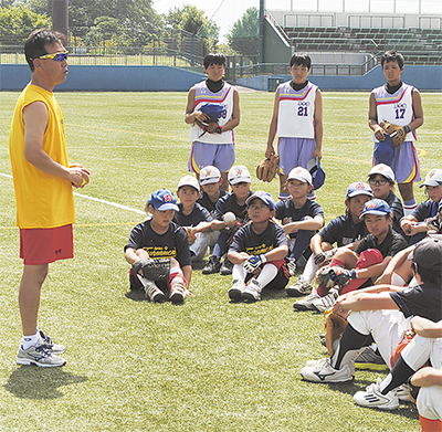実践の部では、宗方監督から遠投やゴロの取り方などを学び、その後はグループに分かれ、部員から一人ひとり丁寧に指導を受けた。参加者からは「上手くなった気がする」との声が聞かれた。