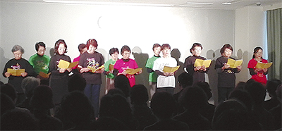 発表会は、厚木群読の会「ひまわり」(会員数18人)が年1回行っているもの。この日は80人以上が駆けつけ会場は満席に。第1部の冒頭、宮澤賢治の『雨ニモマケズ』を、出演者全員で決められたパート順に朗読。続いてグループごとに、鈴木敏史さんの『星の美しい村』や、宮尾節子さんの『明日戦争がはじまる』などの詩を読み上げた。