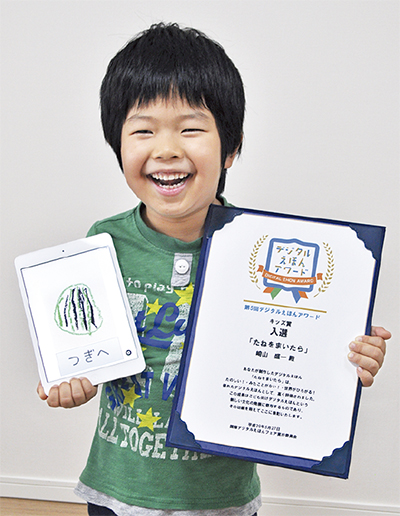 「第5回デジタルえほんアワード」の入賞作品が5月27日に発表され、厚木小学校1年の崎山盛一くんが制作したスマートフォンアプリ「たねをまいたら」がキッズ賞の入選に選ばれた。同アワードには初入賞。