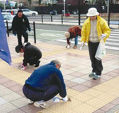 当日は早朝から石田子安神社で同会主催のラジオ体操を開催。そのまま参加する人、石田商工振興会メンバーほか40人以上が参加して清掃活動が行なわれた。2度目のガム取りだが、まだまだ多く、参加者は一生懸命に清掃をしていた。足立会長は「会もだんだんまとまってきました。一歩一歩進んでいきたい」と話す。