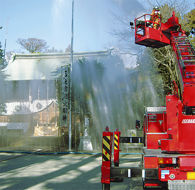 伊勢原市でもこの日に合わせて、市内の貴重な文化財を災害から守ることを目的に訓練を行なっている。今年も市内三ノ宮の比々多神社、大山の茶湯寺の2ヵ所で伊勢原市消防署と消防団による合同放水訓練が実施された。