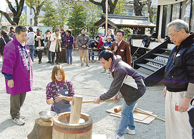 当日は、ベトナム・タイ・フィリピン・中国他の出身者らが多数参加。臼と杵を使い餅つきを楽しんだ。初めて杵を持つという中国からの参加者は「力を入れずに、杵の重さで振り落とすという感覚が難しかったが楽しかった」と笑顔だった。