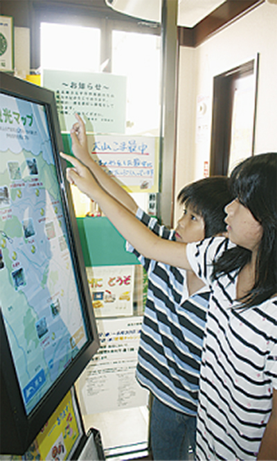 1日約50,000人が乗降するという伊勢原駅で観光案内や市特産物、観光みやげ品などを市民や観光客、大山登山者らに発信するのがねらい。高さ160cm・幅48cm、32インチの液晶画面に触れるとさまざまな情報が見られる。ほかに「おみくじ」のコンテンツも搭載。ボタンに触れると「大吉」「中吉」などの文字が現れ、今日の運勢を楽しそうに占う子どもたちの姿も見られた。