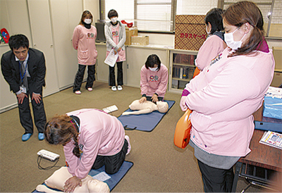 市内の幼稚園・保育所など24施設では現在、職員を対象としたAED(自動体外式除細動器)の操作方法を学ぶ研修会が順次実施されている。
