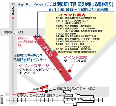 伊勢原の早春の風物詩のひとつとなっている大山登山マラソン―。第27回大会が3月11日(日)に開催される。伊勢原駅北口をスタートに大山阿夫利神社下社までの9・0Km、1610段の石段に標高差約650mのワンウェイコースは県内屈指の難コースとして人気。今年は男女合わせて2492人と過去最高の人数がエントリーしている。またスタート地点となる伊勢原駅北口の『竜神通り』では、ランナーの歓迎と震災の復興を願うイベントも開催される。