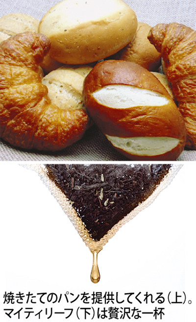 ランチは平日の午前11時から午後3時(L・O2時)。コース料理(1620円※税込)に日替わりパン食べ放題と紅茶の飲み放題が付く。パンはオーブンで焼いたデニッシュ系、ソフトパンをご用意。紅茶は、健康志向の強い米国サンフランシスコで生まれた「マイティリーフ」がずらり。