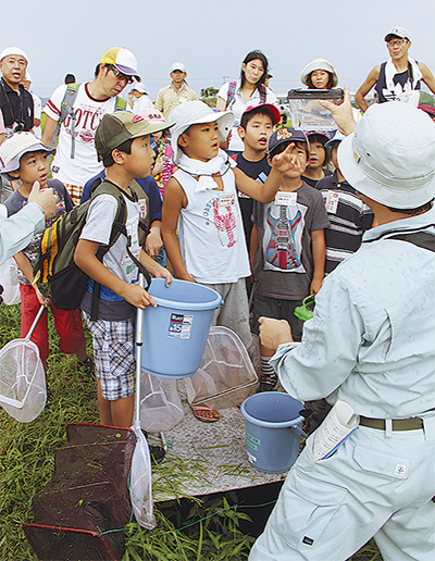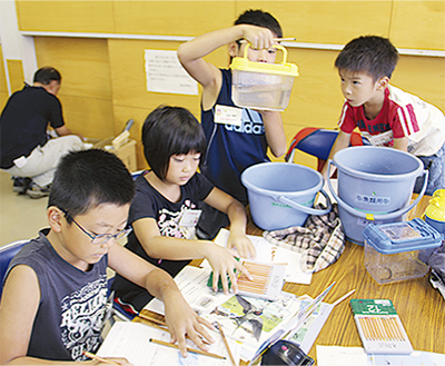 外での調査を終えた一行は、会場を大田ふれあいセンターに移し、調査の集大成として見つけた生きもの調査書を作成。市内から3家族8人のグループで参加した江尻延子さんは「昔はよく田んぼで遊んだものです。けっこう魚が多かった」と話す。グループの北野敦也くん(桜台小4年)・加奈子さん(同3年)の兄妹は「エビやカエルとか、いっぱい採れた」とバケツや虫かごをみんなで見ていた。