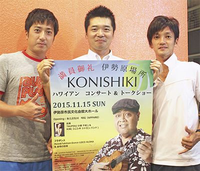 大相撲の元大関・小錦八十吉さん(52歳)が11月15日、市民文化会館大ホールで「ハワイアンコンサート&トークショー」(共催/市民文化会館事業協会)を開催する。午後3時半開場、4時半開演。これは小錦さんの元マネージャー田和弘延さん(33歳/写真中央)ら伊勢原市出身の有志3人が小錦さんにかけ合い実現させた企画。開催目的は「旅の恩返し」だという。
