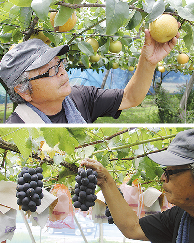 県内でも有数の収穫量を誇る「ブドウ」と「梨」。ブドウは、市内41戸でデラウェア・巨峰・ピオーネ・藤稔などが栽培され、栽培面積は7・38ヘクタール。梨は58戸が幸水や豊水を中心に栽培し、栽培面積は14・58ヘクタールになる。