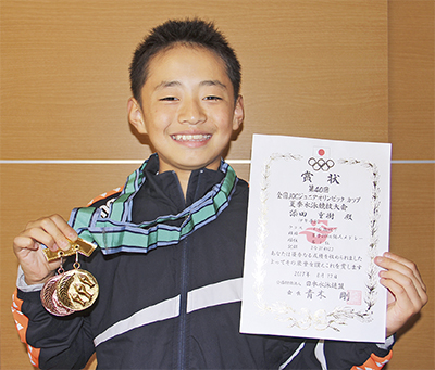 笑顔で2つのメダルを手にする比々多小5年生の添田重樹君(伊勢原スイミングクラブ所属)。この夏の終わり、8月22日から26日に東京辰巳国際水泳場で開催された第40回「全国JOCジュニアオリンピックカップ・夏季水泳競技大会」(主催/(公財)日本水泳連盟)に出場し、10歳以下クラス200m個人メドレーで初優勝。同クラス50m背泳ぎでも3位に入る大健闘をみせた。