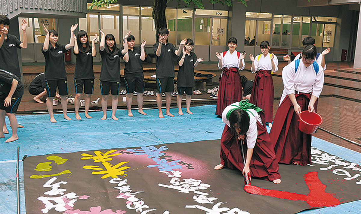 今回令和とともに書いたメッセージは「踏み出そう一歩 夢あふれる未来 咲き誇れ青春」。部長の大久保愛菜さん(3年)は「これからの未来、令和への思いを込めた。私たち3年生は今年で卒業するので、未来の自分たちへのメッセージを入れた」と思いを話した。