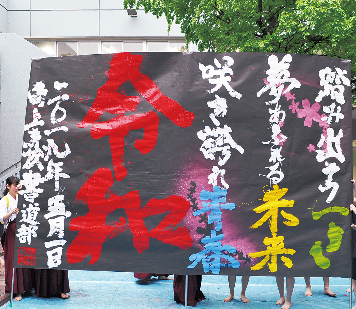 向上高校書道部(高橋邦夫顧問・部員19人)が新元号令和に向けて4月24日、同校の中庭で縦3m、横4mほどの模造紙に令和の文字と未来に向けたメッセージを書き上げた=写真。