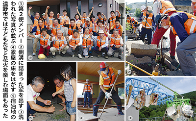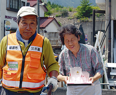依頼先の民家の壁には高さ140cmあたりまで津波の泥跡が残り、無残に折れ曲がった廃車なども残されていた。約50mの区間、側溝の泥をかき出して土のう袋に詰める力作業。気温30度、炎天下の作業に、近くに住む女性が氷水を差し入れする場面もあり、メンバーの1人は「大変だろうに、こんなに優しい。沁みるね」と水を味わっていた。