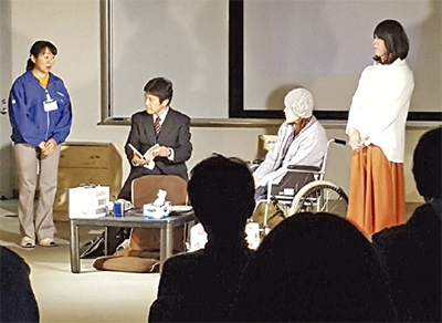 その後、綾瀬ボランティアセンター登録団体である「演劇集団ほりごたつ」が、「はじまりの一歩」を上演。1人の主婦が「認知症のご近所さん」との関わりを通し市民後見人について興味を持っていく話を見ながら、市民後見人とはどのようなものかを学んだ。