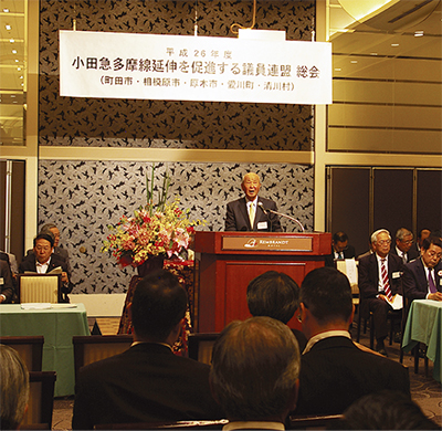 小田急多摩線延伸を促進する議員連盟(久保田義則会長)の2014年度総会が5月15日、厚木市中町のレンブラントホテル厚木で開かれた。会場には、愛川町、清川村、町田市、相模原市、厚木市の議会議員と来賓の市町村長ら84人が出席した。