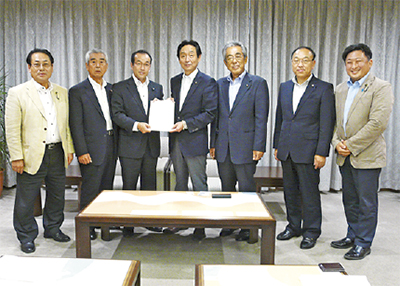 この日は、村上俊光会長(清川村議会議員)をはじめ同協議会の議員4人に加え、要望活動に協力している馬場学郎県議と佐藤知一県議が県庁を訪問。出席した吉川伸治副知事らに要望書を渡したほか、土井議長にも要望書を手渡した。