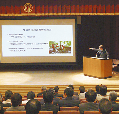 研修会では、清川村議会副議長で県猟友会清川支部長を務める山本雅彦氏が「有害鳥獣駆除の現状について」と題して講演を行ったほか、ヤマザキ学園大学動物学部動物看護学科教授で農学博士の安藤元一氏が「有害鳥獣の生態について」をテーマに講演した。