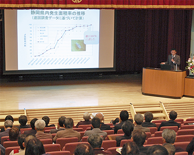 また、講演会では静岡県農林技術研究所茶業研究センターの小澤朗人氏を講師に招き、静岡県の茶園で蔓延しつつある「チャトゲコナジラミ」について、発生の実態や防除対策のポイントを聞いた。