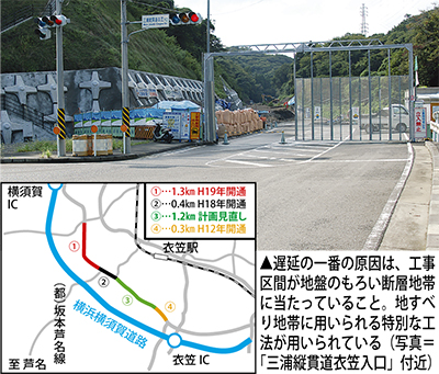 最終となる「衣笠工区」は20年に着手。今年度中の開通を目指していたが、軟弱地盤と言われる「葉山層群」が工事区間の大半を占めるため、予定よりも大掛かりな擁壁工事が必要になっている。これに加え、土壌から検出された天然砒素の処分に時間が割かれていることも計画に遅れを生じさせている原因となっている。