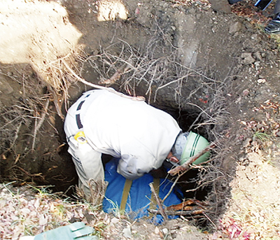 除染作業は、除染した土砂を土のう袋に入れ、さらに2重のビニール袋に包んだものを、50cmの覆土を行い、敷地内に埋めるという方法をとっている。これは、土砂の処分先が決まっていないためで、除染措置前後にも線量測定を行い、安全を確認しているという。