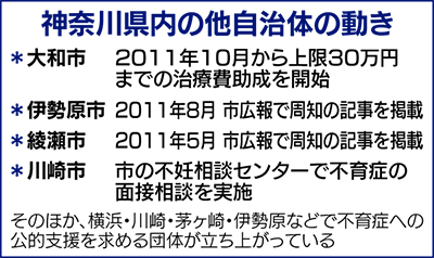 不育症の治療に関しては、研究も進んでいるが、それをとりまく経済的・精神的な支援は遅れているのが現状だ。治療に関する情報や、相談窓口も少なく、流産を繰り返すことで受ける精神的な負担は大きい。「早く知って、治療が受けられていれば」という声も多いという。また、不育症と診断された場合の治療にも多額な出費を要する。流産を引き起こす要因のひとつ「抗リン脂質抗体症候群」に対する治療法として「ヘパリン自己注射療法」があるが、保険適応ではないため、自己負担を強いられている。大和市では昨年10月、治療費の上限30万円を助成する事業を開始したが、こうした独自の助成を行っているのは全国で16自治体にとどまる(平成24年1月現在)。治療をしながら出産にいたった場合でも、通常の2倍近くの費用を要するという。昨年末、ヘパリン注射に関しては保険が適用されることになったが、一部の症状に限るもので、大きな負担減にはつながっていないようだ。