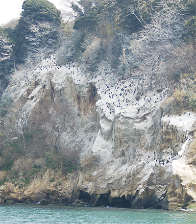 また、この時期になると北国から越冬で飛来する海鵜(ウミウ)の姿を定期船上から見ることができる。島の西側崖には毎年数百羽単位の海鵜が羽を休め、そのフンによって断崖を真っ白に染める光景が一帯の冬の風物詩となっている。