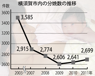横須賀共済病院でも一時休診していたが、医師を確保し診療を再開。それにより、09年度約2600件だった分娩数は昨年度2700件に増加した。現在、市内で分娩可能な診療所は4軒、病院3軒(うち1軒が院内助産のみ)、助産院2軒で対応し、お産難民現象はほぼ解消している。