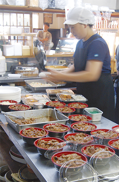 田浦中に弁当を届ける「ごはん亭船越店」では、日替わり弁当など数種類を用意。価格も400円前後に抑え、食べ盛りの生徒のためカルビ丼などボリューム満点のメニューもある。