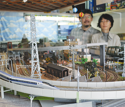 店内に鉄道ジオラマを設置したのは去年。「何か面白い店にしたかった」と話し、遠方から来る鉄道ファンや近所の子どもたちに開放している(10分200円〜300円)。