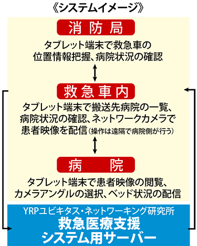 横須賀市とYRPユビキタス・ネットワーキング研究所は今月から、病院と救急車を情報通信端末でつなぐ「救急医療支援システム」の実証実験に着手した。救急車両に搭載したカメラやタブレット端末を使用して、傷病者の映像を医師に提供するほか、病院のベッドの使用状況などをリアルタイムで共有する。実用化をめざして来年3月末まで行う。