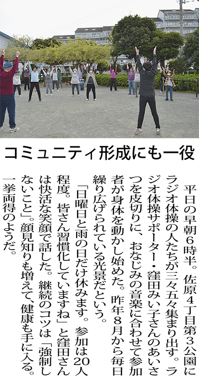市は昨年度、地域でラジオ体操の指導や普及活動を担うラジオ体操サポーターの養成講座を開いた。現在99人が認定を受けている。今年度はサポーターの拡大を図るとともに、自治会や町内会単位で取り組む団体にCD・ラジオ、のぼり旗などのスタートセットを配布する。現時点で活動している7〜8グループを今年度中に50団体まで拡大したい意向だ。