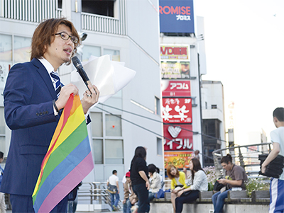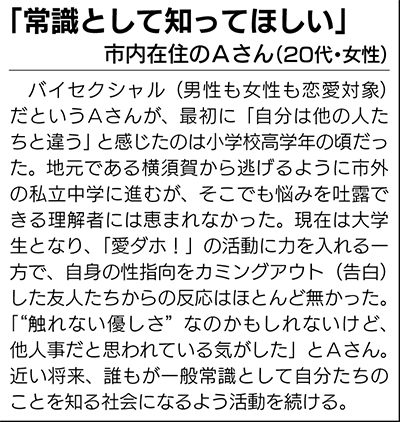 同性愛や性同一性障害など、さまざまな性への理解を求める街頭キャンペーンが17日、横須賀中央のYデッキで行われた。1990年5月17日に同性愛が世界保健機関(WHO)の精神疾患リストから削除されたことに由来する。当事者らで発足した全国組織「やっぱ愛ダホ!idaho-net」が企画し、社会的弱者への対策に力を入れる藤野英明市議や市内在住の当事者らが参加した。事前にインターネットで募集したメッセージの朗読では、「職場で同性愛ネタの笑い話が。私だってレズビアンなのに。悪気はないんだろうけど…」といった、多様な性への悩みや意見が語られた。