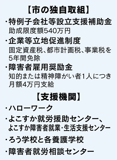 せっかく福祉施設で訓練を受け、障がい者の就労意欲が高まっても雇用する企業がなければ力を発揮することができない。そこで市では横須賀商工会議所や公共職業安定所(ハローワーク)などと、障がい者雇用の推進を図るため相互連携を強化。未だ設置が進まない特例子会社の誘致・設立費用の一部助成や、雇用奨励金支給など独自策で後押しする。今年度末までに、就労移行支援・就労継続支援を受けた障がい者12人が一般就労できるよう具体的な数値目標を掲げ、取り組みを進めている。