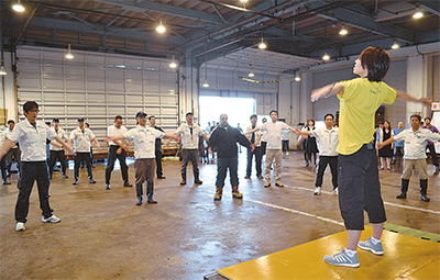 22日には、平成町の横須賀魚市場で出張教室が行われた。企業に出向く形態は今回が初めて。午前9時、早朝から勤務している従業員らは仕事の手を休めて倉庫内の一角に集合。指導員の「動かしている筋肉を脳で意識してください」といったアドバイスに従いながら、身体をほぐした。