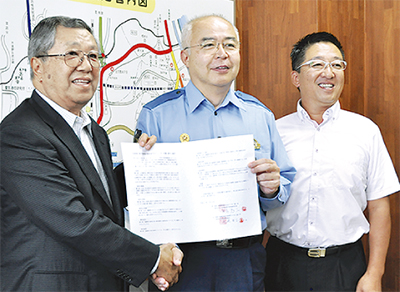 土木・建設業者の丸孝産業(吉井2丁目)は、災害発生時における重機使用に関する協定を浦賀警察署と交わし、23日に同署で締結式を行った=写真。